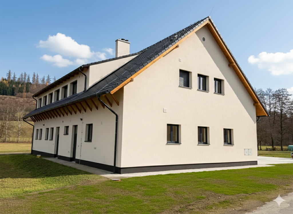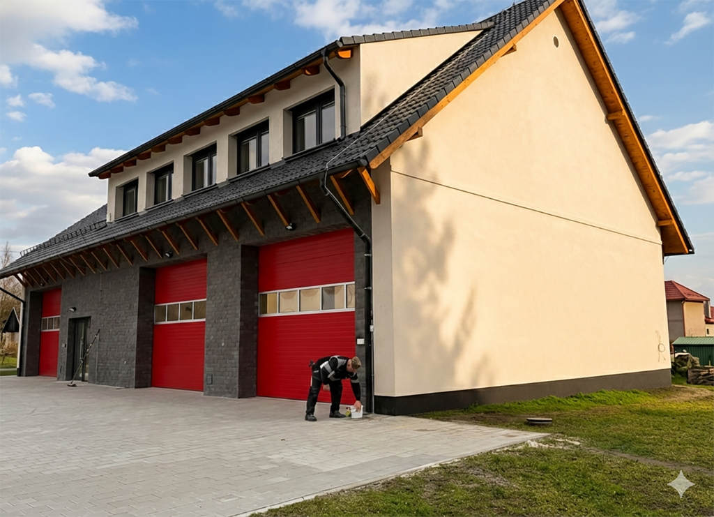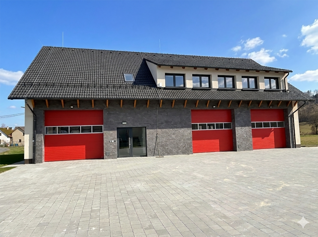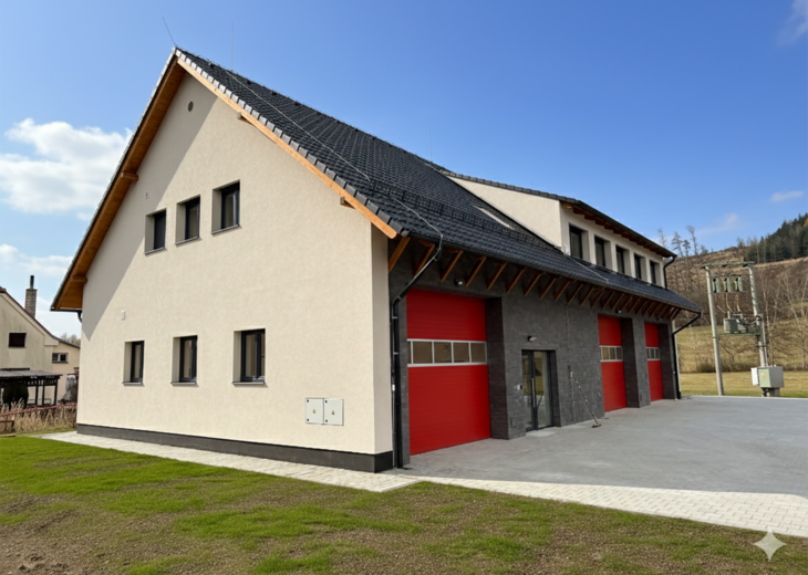 Na konci roku 2025 jsme dokončili výstavbu nové požární zbrojnice v Bezděkově. Předmětem zakázky byla stavba nového objektu včetně demolice stávající požární zbrojnice. V projektu bylo navrženo garážování tří požárních automobilů, šatnové a hygienické zázemí pro hasiče, prostory pro praní oděvů, a v patře klubovní místnost. Zbrojnici jsme vzhledem k silnému podmáčení posadili na 7,5 m dlouhé piloty.